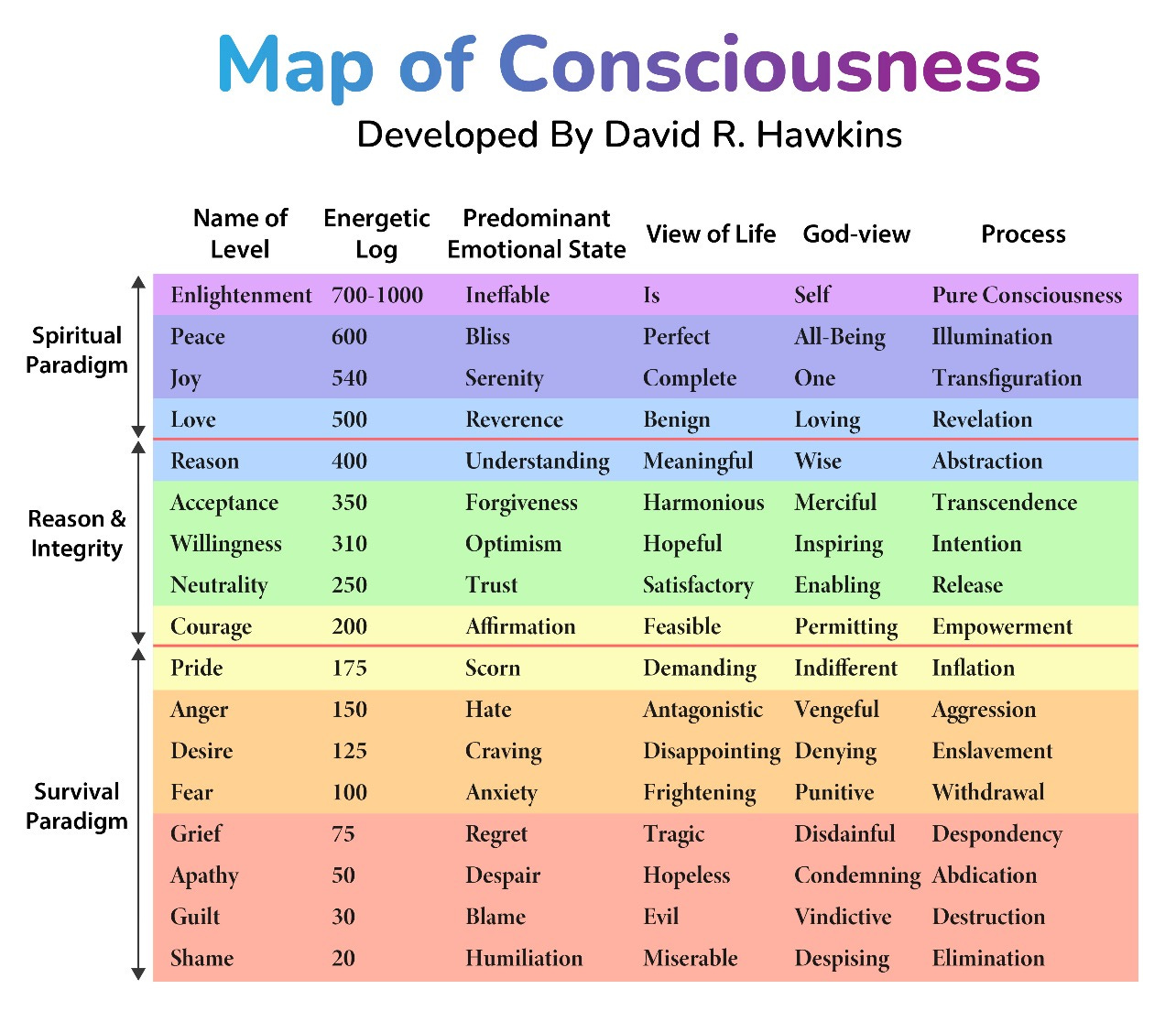 •Above 200: Positive states including neutrality, willingness, acceptance, reason, love, and enlightenment.